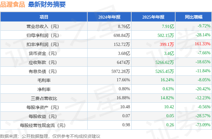 据证券之星公开数据拾掇,截至本演讲期末,公司停业总收入7。91亿元,同比下降9。72%,归母净利润502。15万元,同比下降28。14%。按单季度数据看,第四时度停业总收入2。02亿元,第四时度归母净利润-713。17万元,同比下降156。08%。本演讲期品渥食物公司应收账款体量较大,当期应收账款占最新年报归母净利润比达1048。81%。本次财报发布的各项数据目标表示不尽如人意。此中,毛利率16。24%,同比减8。05%,净利率0。63%,同比减20。42%,发卖费用、办理费用、财政费用合计1。17亿元,三费占营收比14。82%,同比减12。23%,每股净资产10。42元,同比减0。56%,每股运营性现金流0。26元,同比减73。09%,每股收益0。05元,同比减28。57%